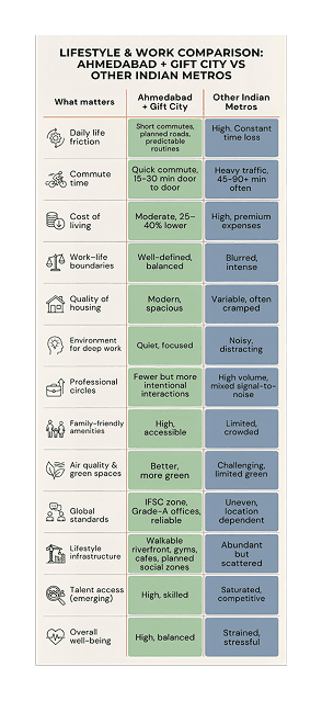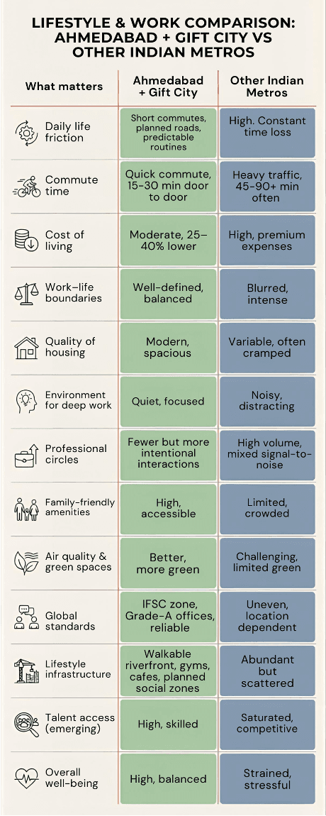 GIFT city is one of the few large Indian cities where livability and scale coexist. The cost of living is 25–40% lower than most major metros. Average commute times are under 30 minutes. Daily life involves less friction. The payoff is simple but meaningful: people arrive at work with more cognitive energy, and they go home with some left.